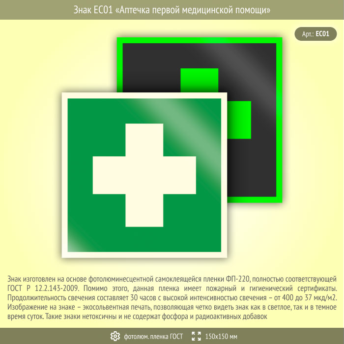 Знак EC01 «Аптечка первой медицинской помощи» (фотолюминесцентная пленка ГОСТ 34428-2018, 150х150 мм) в Яхроме купить