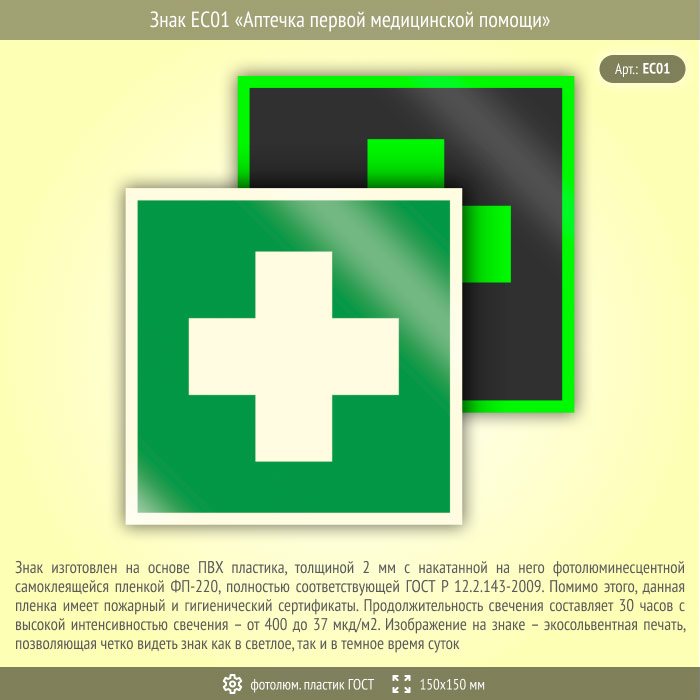 Знак EC01 «Аптечка первой медицинской помощи» (фотолюминесцентный пластик ГОСТ 34428-2018, 150х150 мм) в Яхроме купить