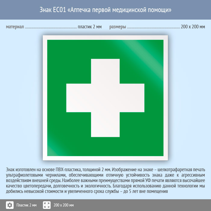 Знак EC01 «Аптечка первой медицинской помощи» (пластик, 200х200 мм) в Яхроме купить