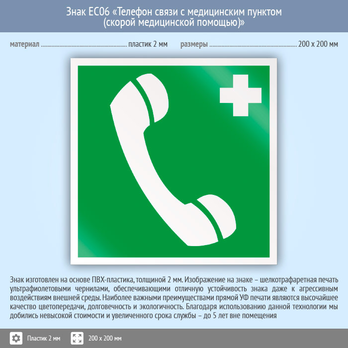 Знак EC06 «Телефон связи с медицинским пунктом (скорой медицинской помощью)» (пластик, 200х200 мм) в Яхроме купить