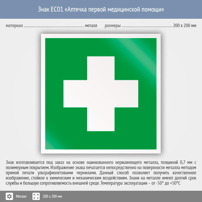 Знак EC01 «Аптечка первой медицинской помощи» (металл, 200х200 мм) в Яхроме купить