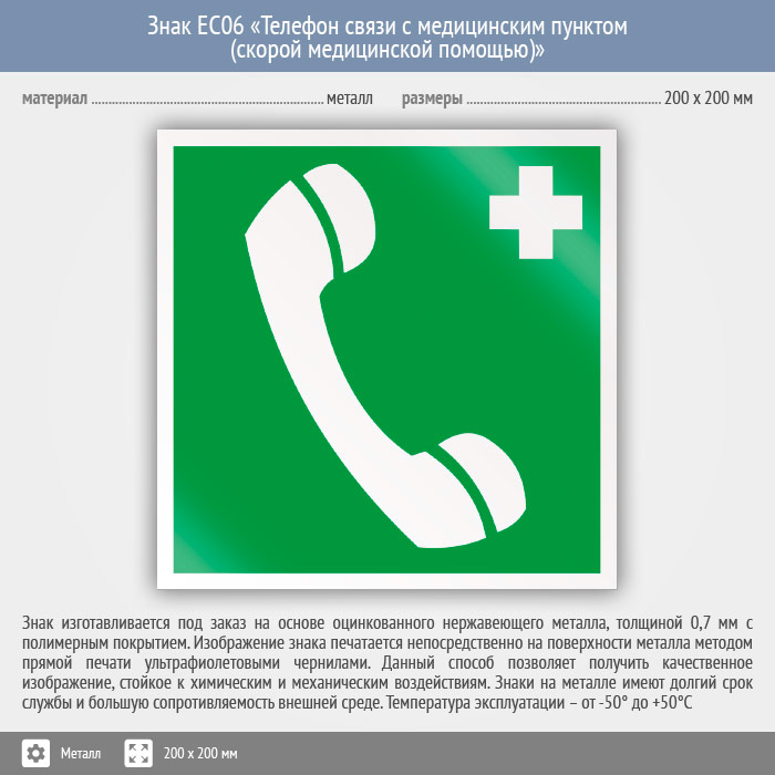 Знак EC06 «Телефон связи с медицинским пунктом (скорой медицинской помощью)» (металл, 200х200 мм) в Яхроме купить
