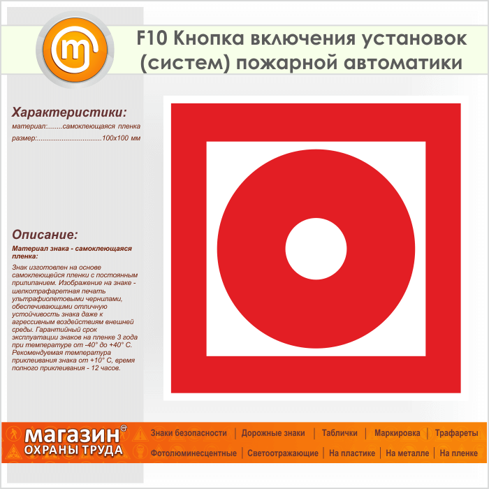 Знак F10 «Кнопка включения установок (систем) пожарной автоматики» (пленка, 100х100 мм) в Яхроме купить
