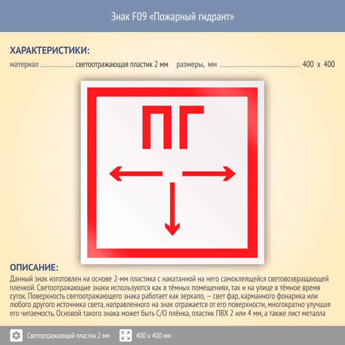 Знак F09 «Пожарный гидрант» (светоотражающий пластик, 400х400 мм) в Яхроме купить