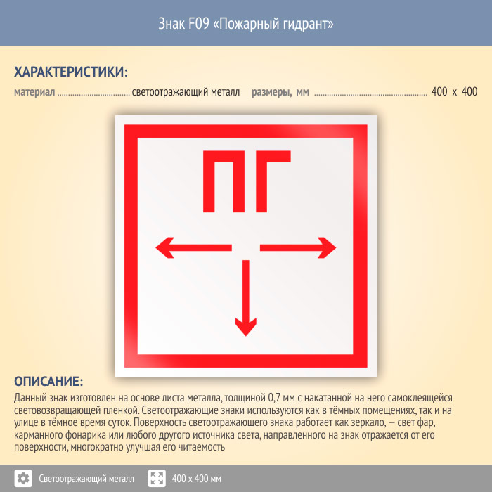 Знак F09 «Пожарный гидрант» (светоотражающий металл, 400х400 мм) в Яхроме купить