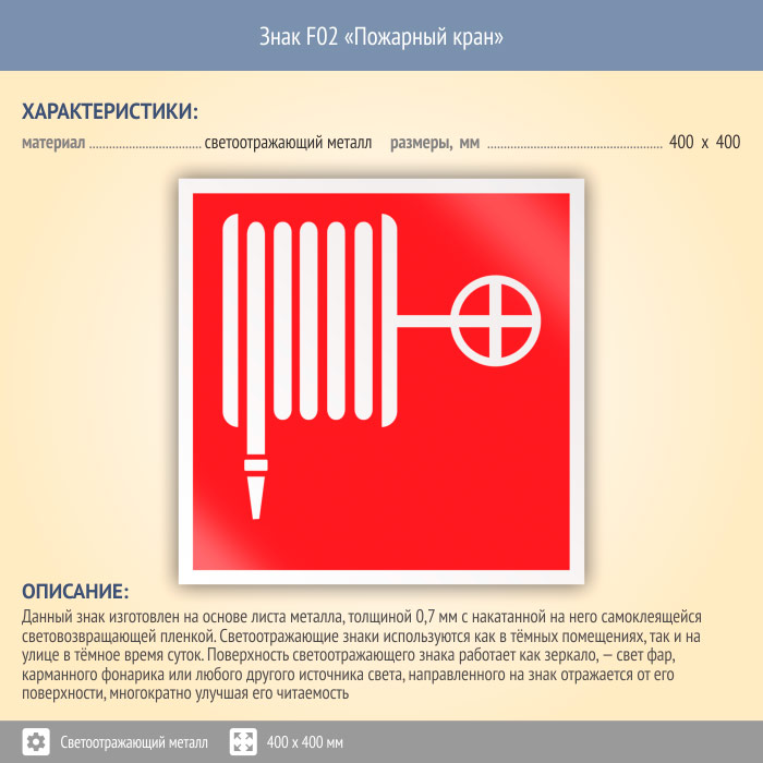 Знак F02 «Пожарный кран» (светоотражающий металл, 400х400 мм) в Яхроме купить