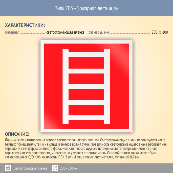 Знак F03 «Пожарная лестница» (светоотражающая пленка, 200х200 мм) в Яхроме купить