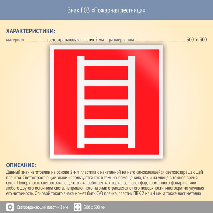 Знак F03 «Пожарная лестница» (светоотражающий пластик, 300х300 мм) в Яхроме купить