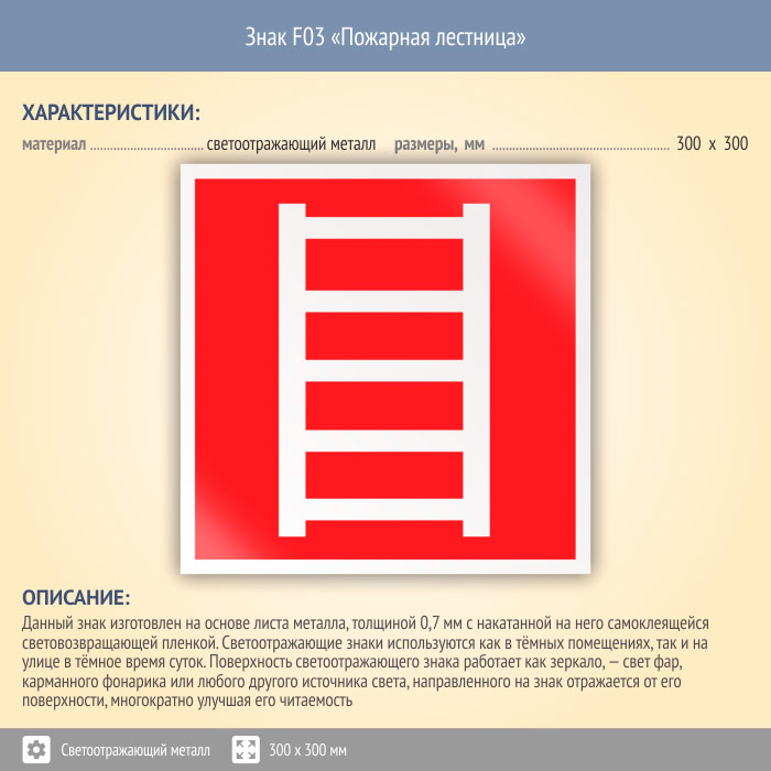 Знак F03 «Пожарная лестница» (светоотражающий металл, 300х300 мм) в Яхроме купить