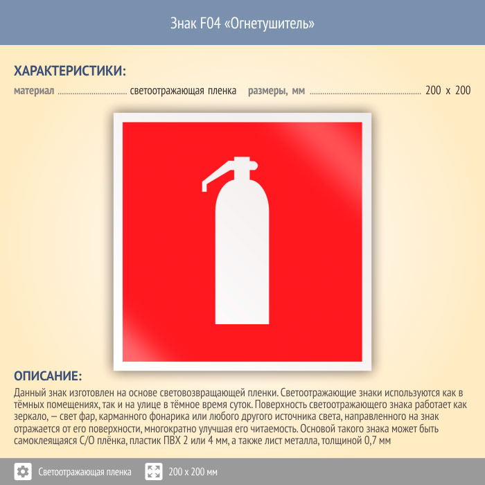 Знак F04 «Огнетушитель» (светоотражающая пленка, 200х200 мм) в Яхроме купить