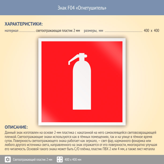 Знак F04 «Огнетушитель» (светоотражающий пластик, 400х400 мм) в Яхроме купить