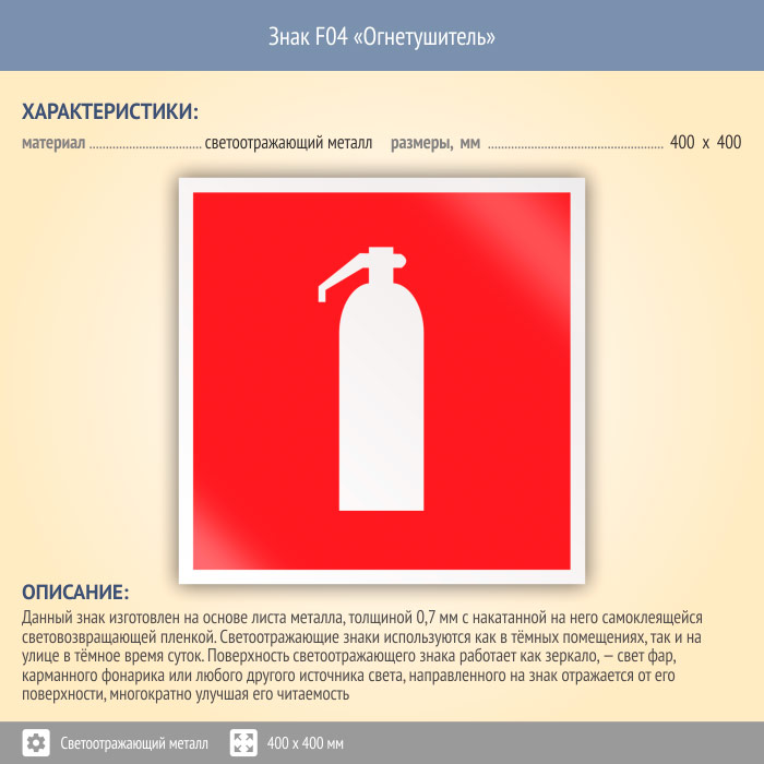 Знак F04 «Огнетушитель» (светоотражающий металл, 400х400 мм) в Яхроме купить
