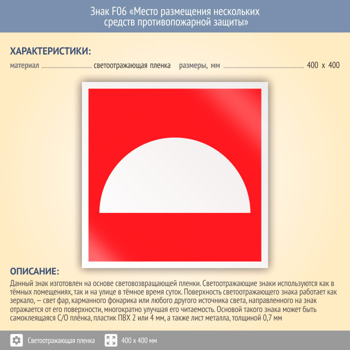 Знак F06 «Место размещения нескольких средств противопожарной защиты» (светоотражающая пленка, 400х400 мм) в Яхроме купить