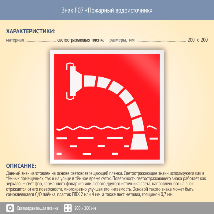 Знак F07 «Пожарный водоисточник» (светоотражающая пленка, 200х200 мм) в Яхроме купить
