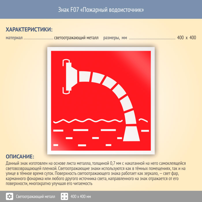 Знак F07 «Пожарный водоисточник» (светоотражающий металл, 400х400 мм) в Яхроме купить