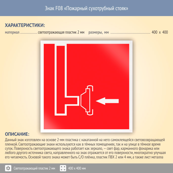 Знак F08 «Пожарный сухотрубный стояк» (светоотражающий пластик, 400х400 мм) в Яхроме купить