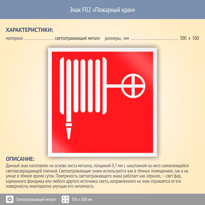 Знак F02 «Пожарный кран» (светоотражающий металл, 300х300 мм) в Яхроме купить
