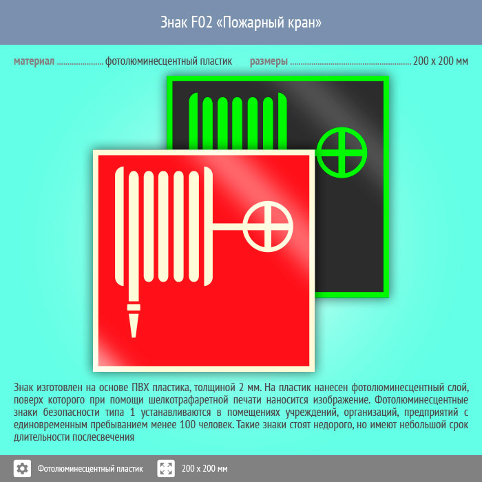 Знак F02 «Пожарный кран» (фотолюминесцентный пластик, 200х200 мм) в Яхроме купить