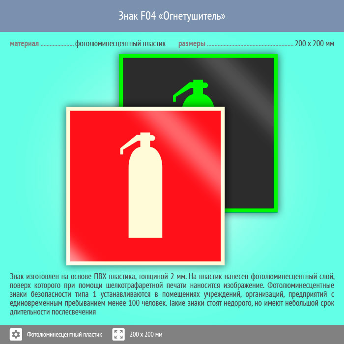 Знак F04 «Огнетушитель» (фотолюминесцентный пластик, 200х200 мм) в Яхроме купить