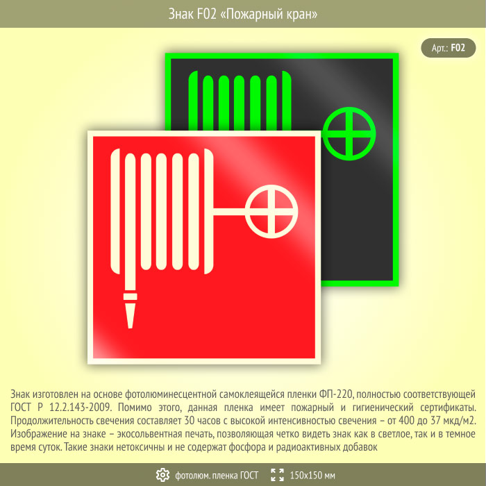 Знак F02 «Пожарный кран» (фотолюминесцентная пленка ГОСТ 34428-2018, 150х150 мм) в Яхроме купить