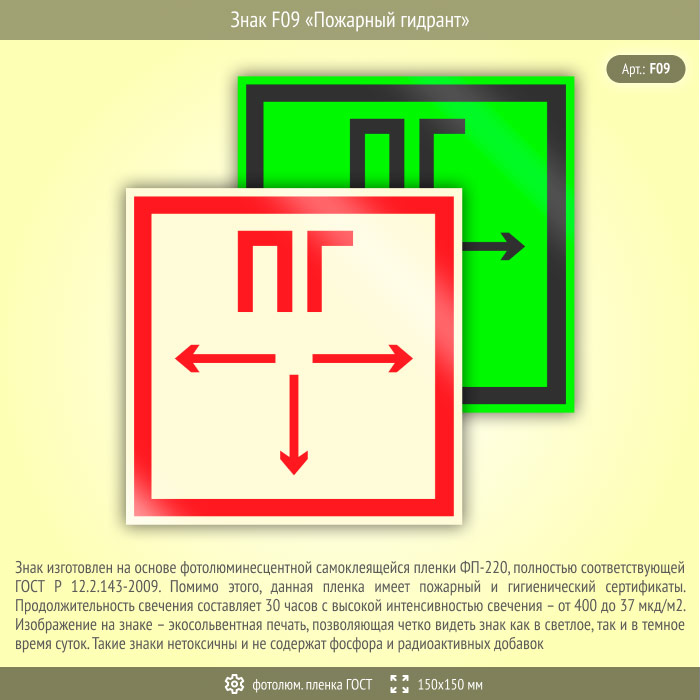 Знак F09 «Пожарный гидрант» (фотолюминесцентная пленка ГОСТ 34428-2018, 150х150 мм) в Яхроме купить