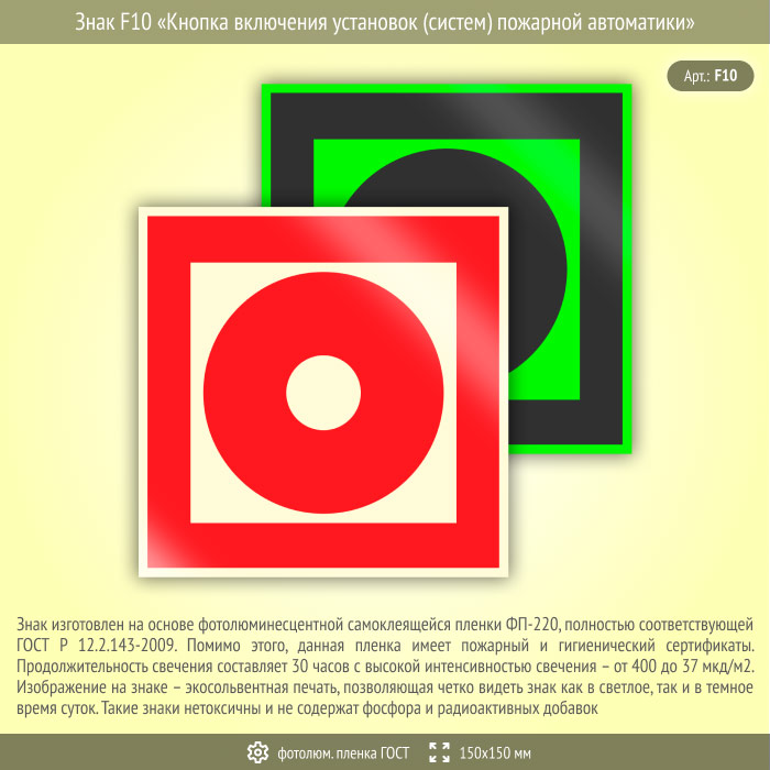 Знак F10 «Кнопка включения установок (систем) пожарной автоматики» (фотолюминесцентная пленка ГОСТ 34428-2018, 150х150 мм) в Яхроме купить