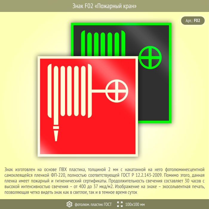 Знак F02 «Пожарный кран» (фотолюминесцентный пластик ГОСТ 34428-2018, 100х100 мм) в Яхроме купить