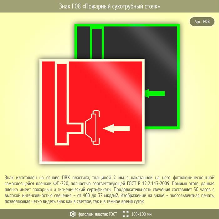 Знак F08 «Пожарный сухотрубный стояк» (фотолюминесцентный пластик ГОСТ 34428-2018, 100х100 мм) в Яхроме купить