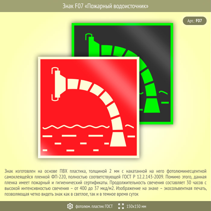 Знак F07 «Пожарный водоисточник» (фотолюминесцентный пластик ГОСТ 34428-2018, 150х150 мм) в Яхроме купить