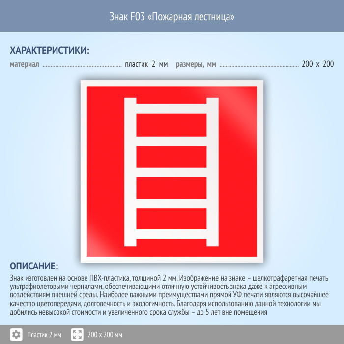 Знак F03 «Пожарная лестница» (пластик, 200х200 мм) в Яхроме купить