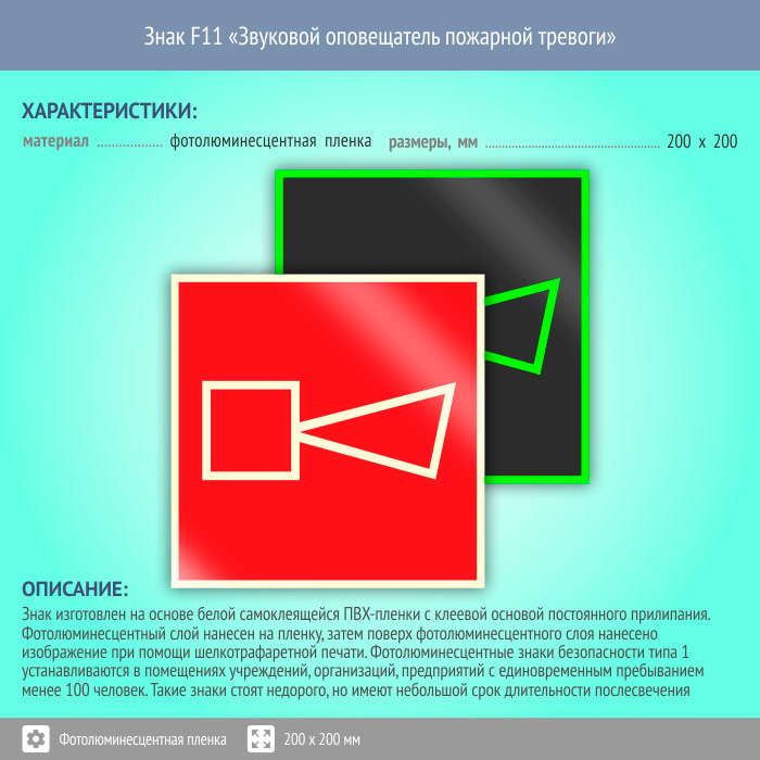 Знак F11 «Звуковой оповещатель пожарной тревоги» (фотолюминесцентная пленка, 200х200 мм) в Яхроме купить
