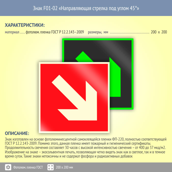 Знак F01-02 «Направляющая стрелка под углом 45°» (фотолюминесцентная пленка ГОСТ 34428-2018, 200х200 мм) в Яхроме купить
