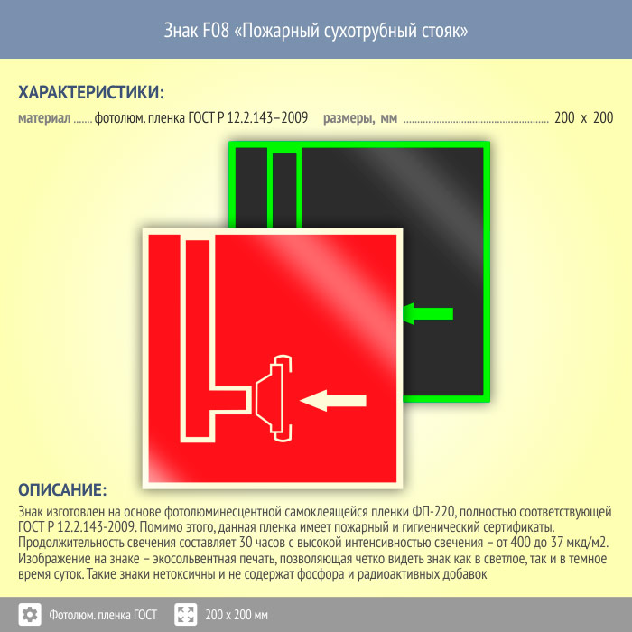 Знак F08 «Пожарный сухотрубный стояк» (фотолюминесцентная пленка ГОСТ 34428-2018, 200х200 мм) в Яхроме купить