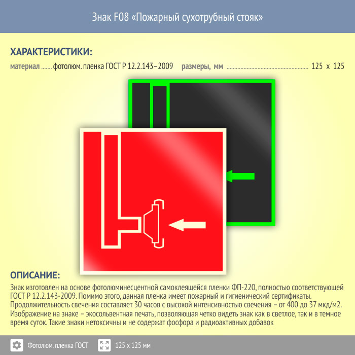 Знак F08 «Пожарный сухотрубный стояк» (фотолюминесцентная пленка ГОСТ 34428-2018, 125х125 мм) в Яхроме купить
