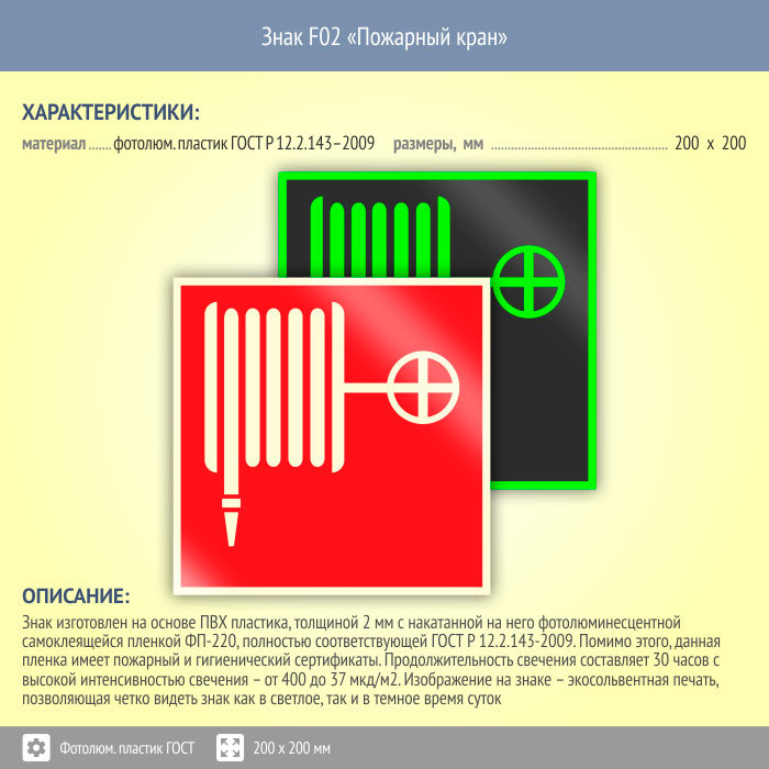 Знак F02 «Пожарный кран» (фотолюминесцентный пластик ГОСТ 34428-2018, 200х200 мм) в Яхроме купить
