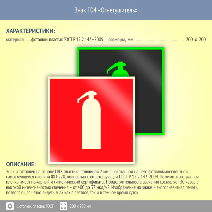 Знак F04 «Огнетушитель» (фотолюминесцентный пластик ГОСТ 34428-2018, 200х200 мм) в Яхроме купить