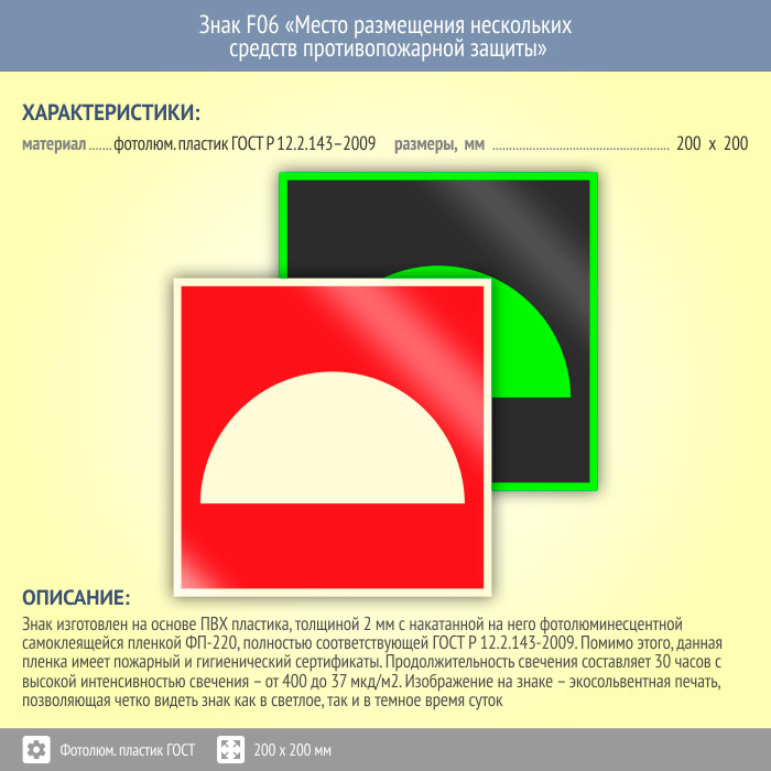 Знак F06 «Место размещения нескольких средств противопожарной защиты» (фотолюминесцентный пластик ГОСТ 34428-2018, 200х200 мм) в Яхроме купить