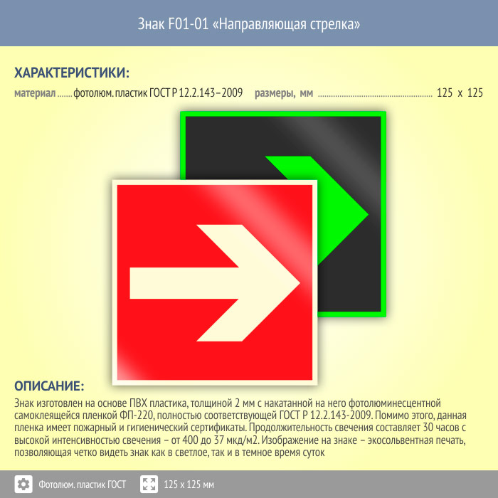 Знак F01-01 «Направляющая стрелка» (фотолюминесцентный пластик ГОСТ 34428-2018, 125х125 мм) в Яхроме купить