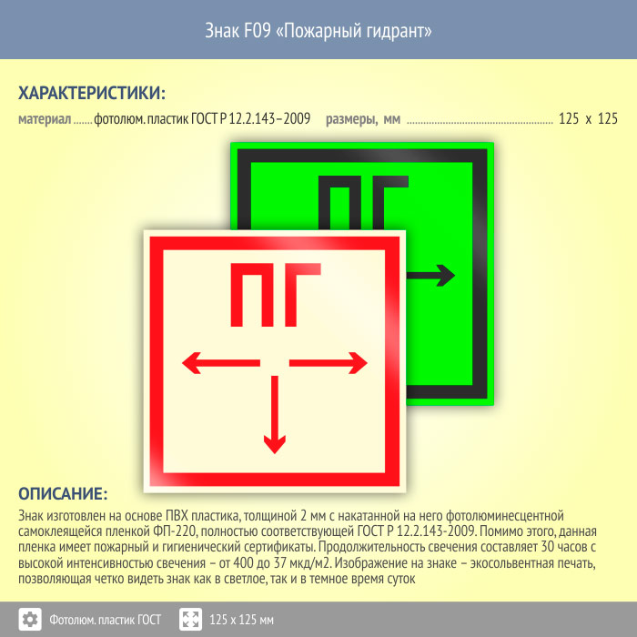 Знак F09 «Пожарный гидрант» (фотолюминесцентный пластик ГОСТ 34428-2018, 125х125 мм) в Яхроме купить