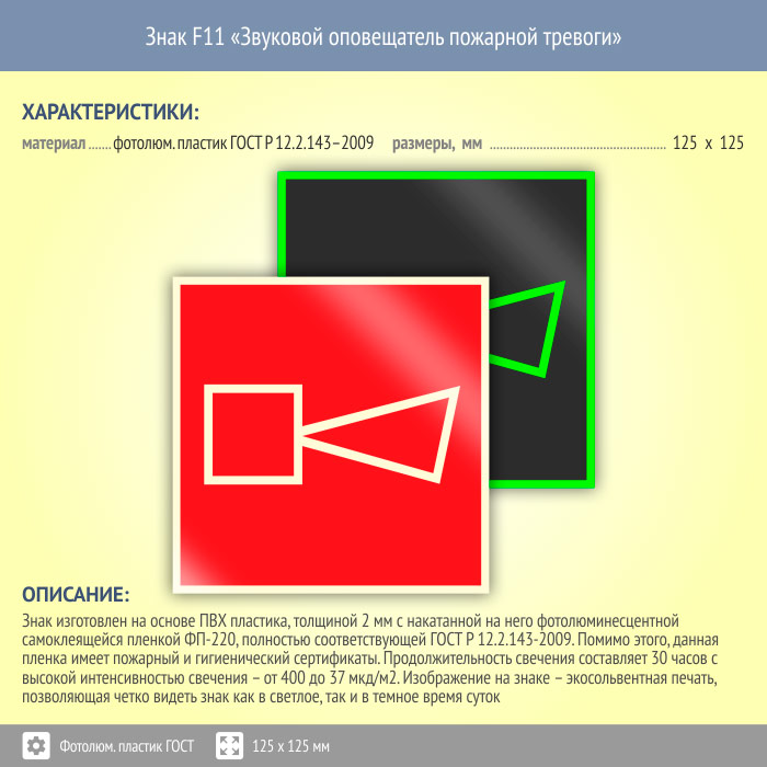 Знак F11 «Звуковой оповещатель пожарной тревоги» (фотолюминесцентный пластик ГОСТ 34428-2018, 125х125 мм) в Яхроме купить