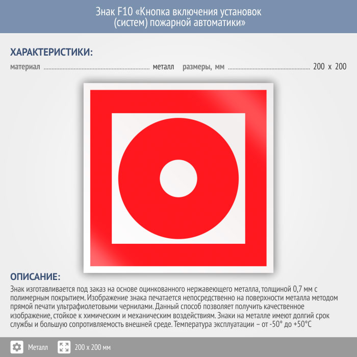 Знак F10 «Кнопка включения установок (систем) пожарной автоматики» (металл, 200х200 мм) в Яхроме купить